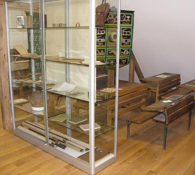 ist, Holzkugeln zum Rechnen, ein alter Ofen und Fleißkärtchen: im Obergeschoss des Heimathauses ist
