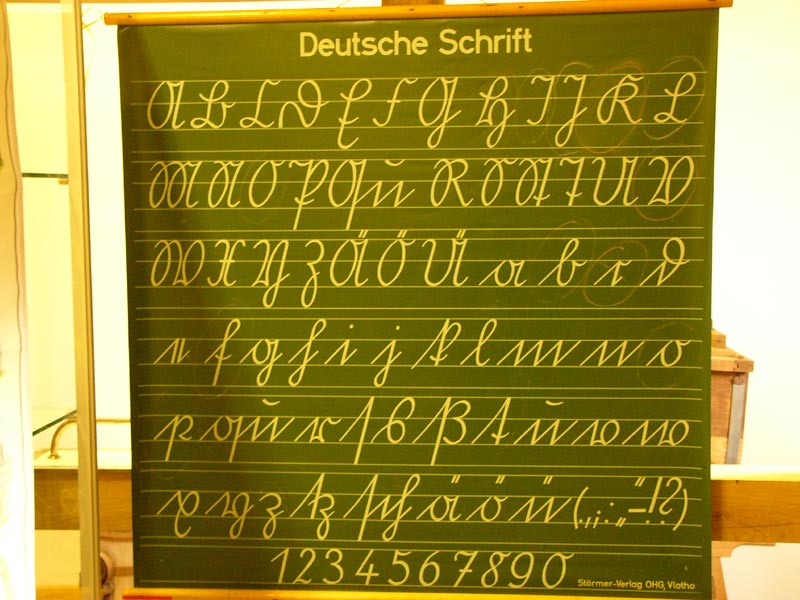 Schulbänke, die aus den 30er und 50er Jahren stammen, eine Tafel, die mit Sütterlinschrift beschrieben