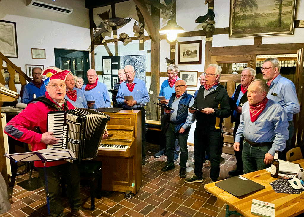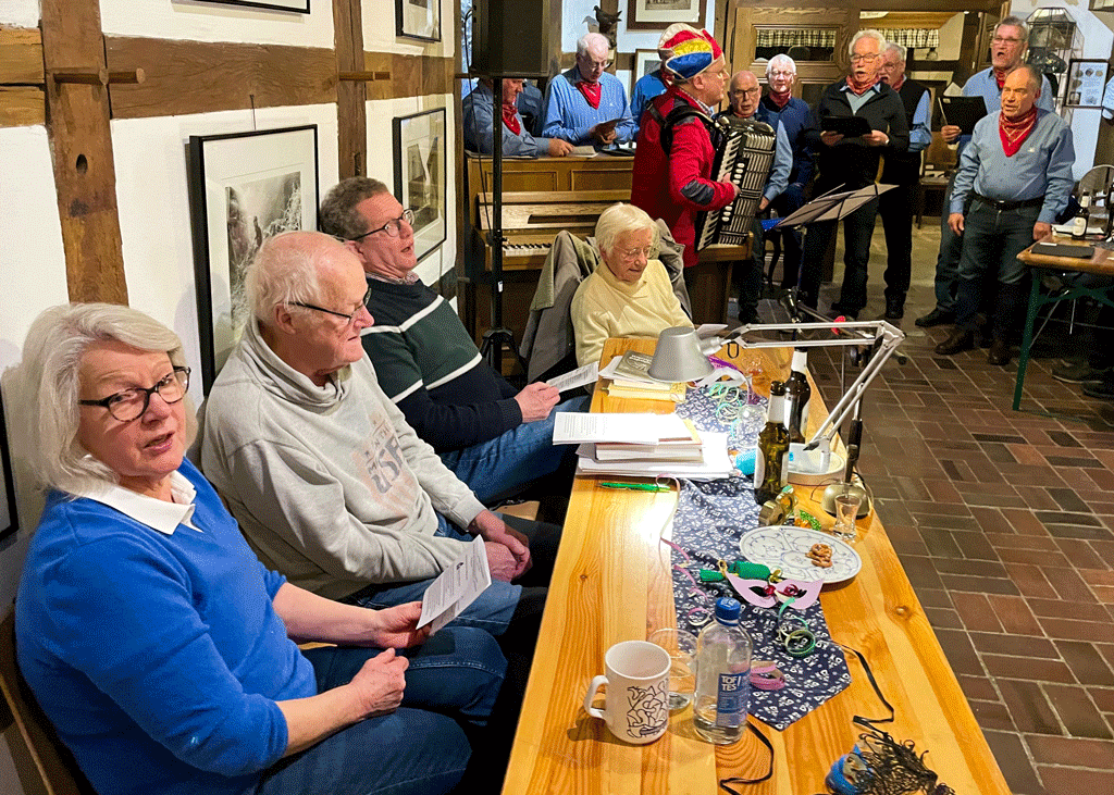 Werner Kövener gab seine Erfahrungen bei seiner ersten Teilnahme als Neunjähriger bei einem Polterabend in der Bauerschaft Überwasser zum Besten, bevor die Biäwersänger unter Leitung von Hubert Bals mit ihren plattdeutschen Melodien zur Unterhaltung beitrugen. Zum Finale brachten die Sänger mit Begleitung von Werner Kövener am Akkordeon die Tenne im Heimathaus noch einmal richtig in Schwung. Ein von Klaus Brandes und Werner Kövener neu zusammengestelltes Medley von Karnevalsliedern lud alle Gäste zum Mitsingen und Schunkeln ein.